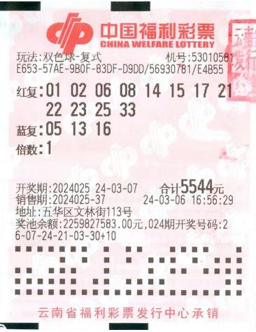 双色球第2024025期开奖,云南彩民又中得1注头奖,出自昆明市五华区文林街113号53010581号销售网点火博体育app官网,中奖彩票是1张投注金额5544元的“12+3”复式票,打算中奖金额883万多元。